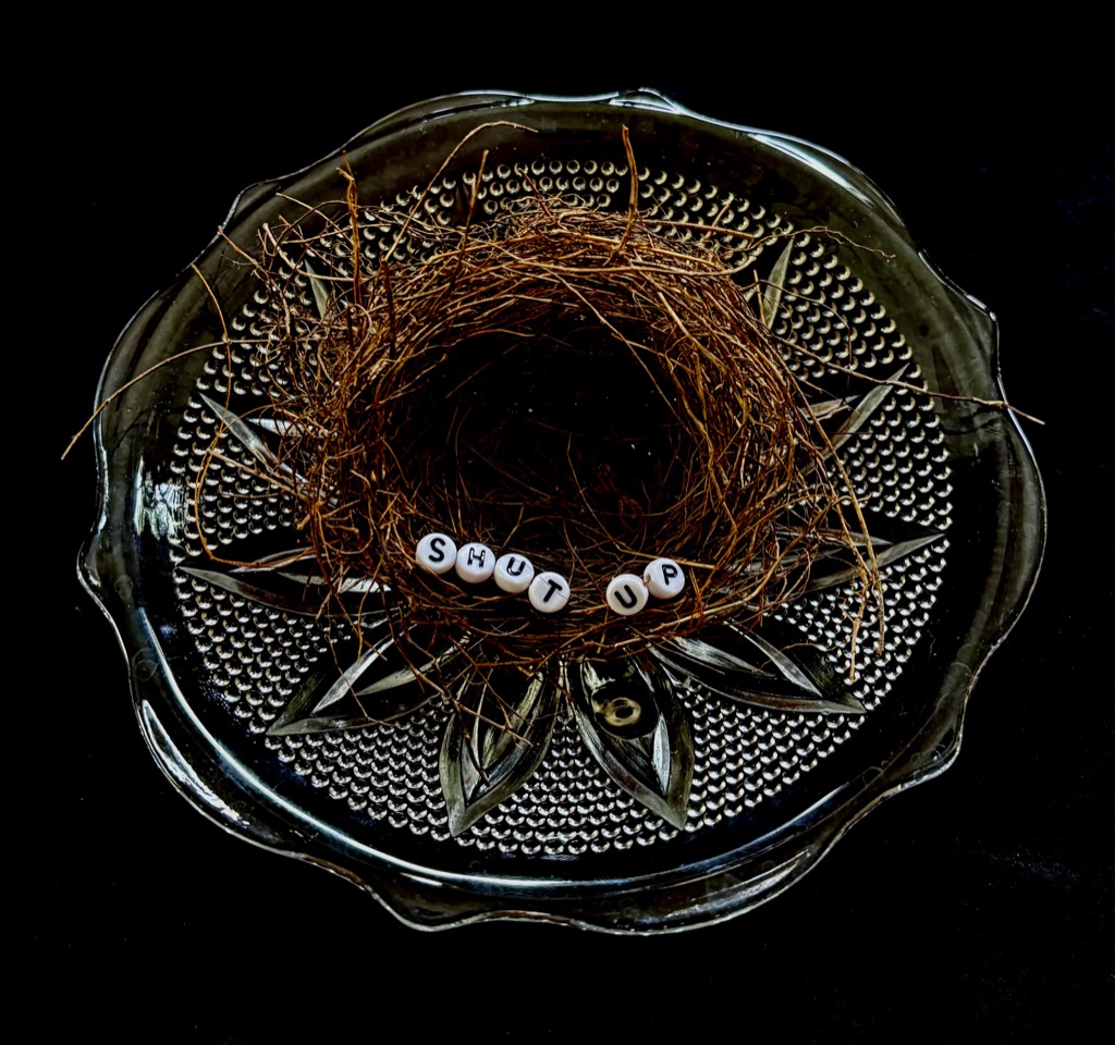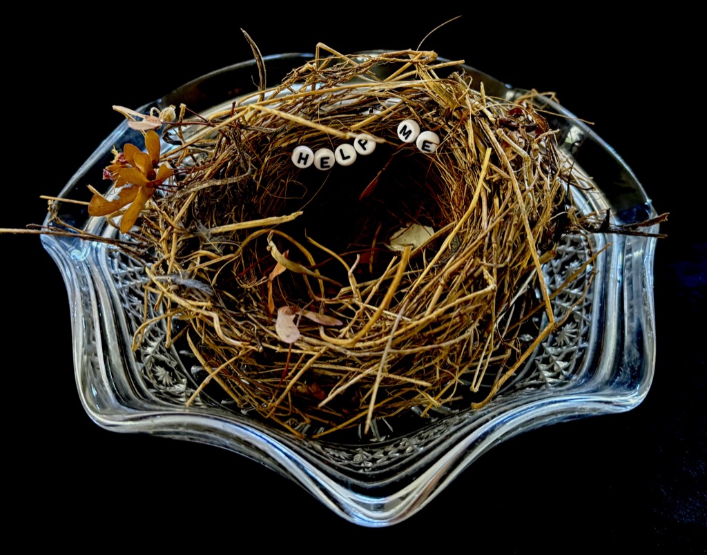 Life Is Served is a series of assemblages created from bird’s nests, lettered beads, and antique glass serving ware. The collective meaning of the works points to the nature of home, comfort, ancestral wisdom, transitions from childhood to adulthood, and life challenges. Southern Gothic sensibilities coupled with Black Irish-style humor, the works signify romanticism, nostalgia, longing, sarcasm, irony, and anger. The text sewn into the nests focuses on words of wisdom, often heard phrases of advice or warning, and/or responses to situations that may or may not be helpful to the recipient. The series continues her autobiographical works, influenced by her upbringing in the Roman Catholic Church (non-practicing) and the American South, as well as her Irish American heritage. Artistic influences for this series include Dutch still-life painting and ritual religious objects/practices found globally.